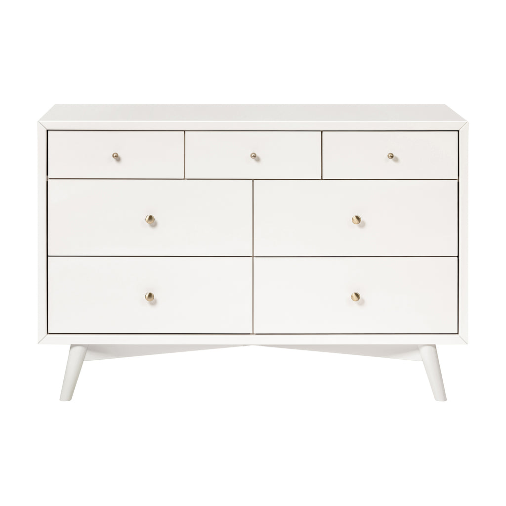 Enhance your child’s bedroom with the Palma 7-Drawer Double Dresser from Babyletto, featuring a sophisticated mid-century design. This elegant piece is defined by its tapered legs, brushed metal hardware, and whisper-quiet drawers that glide open effortlessly. With three smaller top drawers and four spacious lower drawers, it provides ample storage for your little one’s daily essentials. Combining style, functionality, and timeless appeal, the Palma Dresser helps keep your space organized and beautifully clutter-free.